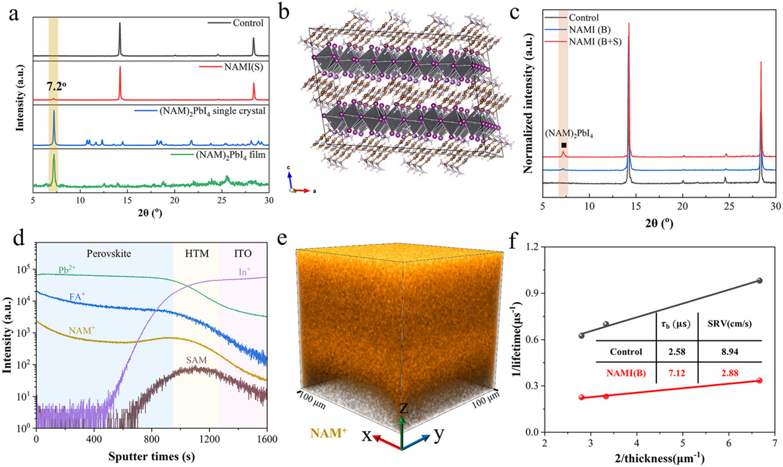 f) 通过变厚度薄膜瞬态荧光寿命(TRPL)衰减曲线拟合获得的对照组与NAMI(B)薄膜体相载流子寿命及表面复合速度(SRV)对比