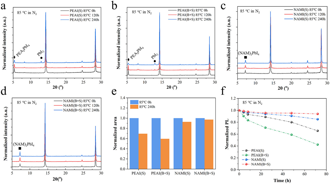 e) 基于PEAI的薄膜在5.3°处和基于NAMI的薄膜在7.2°处的二维钙钛矿特征峰归一化强度对比(85℃氮气环境热退火120小时前后)