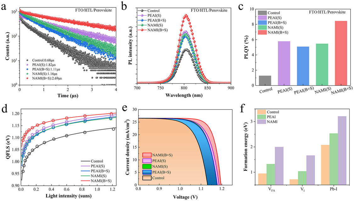f) 钙钛矿薄膜在未处理、NAMI及PEAI钝化条件下的缺陷形成能对比(包含FA空位缺陷VFA、碘空位缺陷VI、铅碘反位缺陷Pb-I)