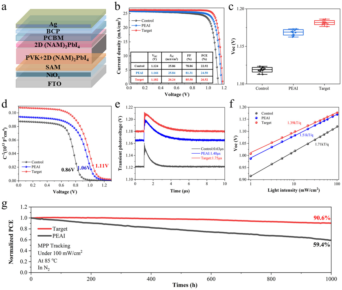 通过脒基体相与表面协同钝化策略,二维/三维钙钛矿太阳能电池实现了26.52%的顶尖光电转换效率,并在85℃最大功率点持续光照1000小时后仍保持初始效率的90.6%,展现出卓越的高温光稳定性。该研究为开发极端工况下高性能、长寿命钙钛矿太阳能电池提供了重要设计思路。