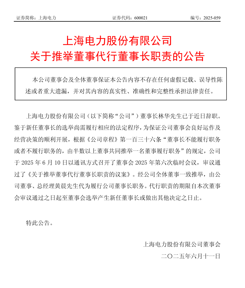 上海电力董事长林华先生已于近日辞职,董事、总经理黄晨代为履行公司董事长职务