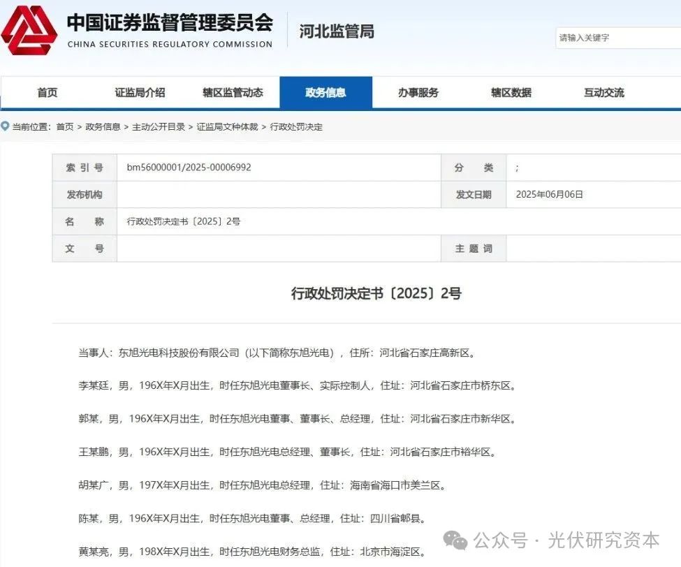 河北证监局行政处罚决定书〔2025〕2号显示,经河北证监局查明,东旭光电在股票和债券市场披露的信息存在虚假记载、重大遗漏;东旭光电非公开发行股票存在欺诈发行;东旭光电未在法定期限内披露2023年年度报告。