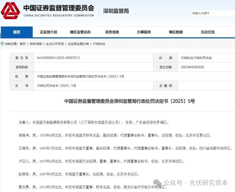 深圳证监局行政处罚决定书〔2025〕5号显示,经深圳证监局查明,东旭蓝天披露的信息存在重大遗漏;东旭蓝天未在法定期限内披露2023年年度报告。