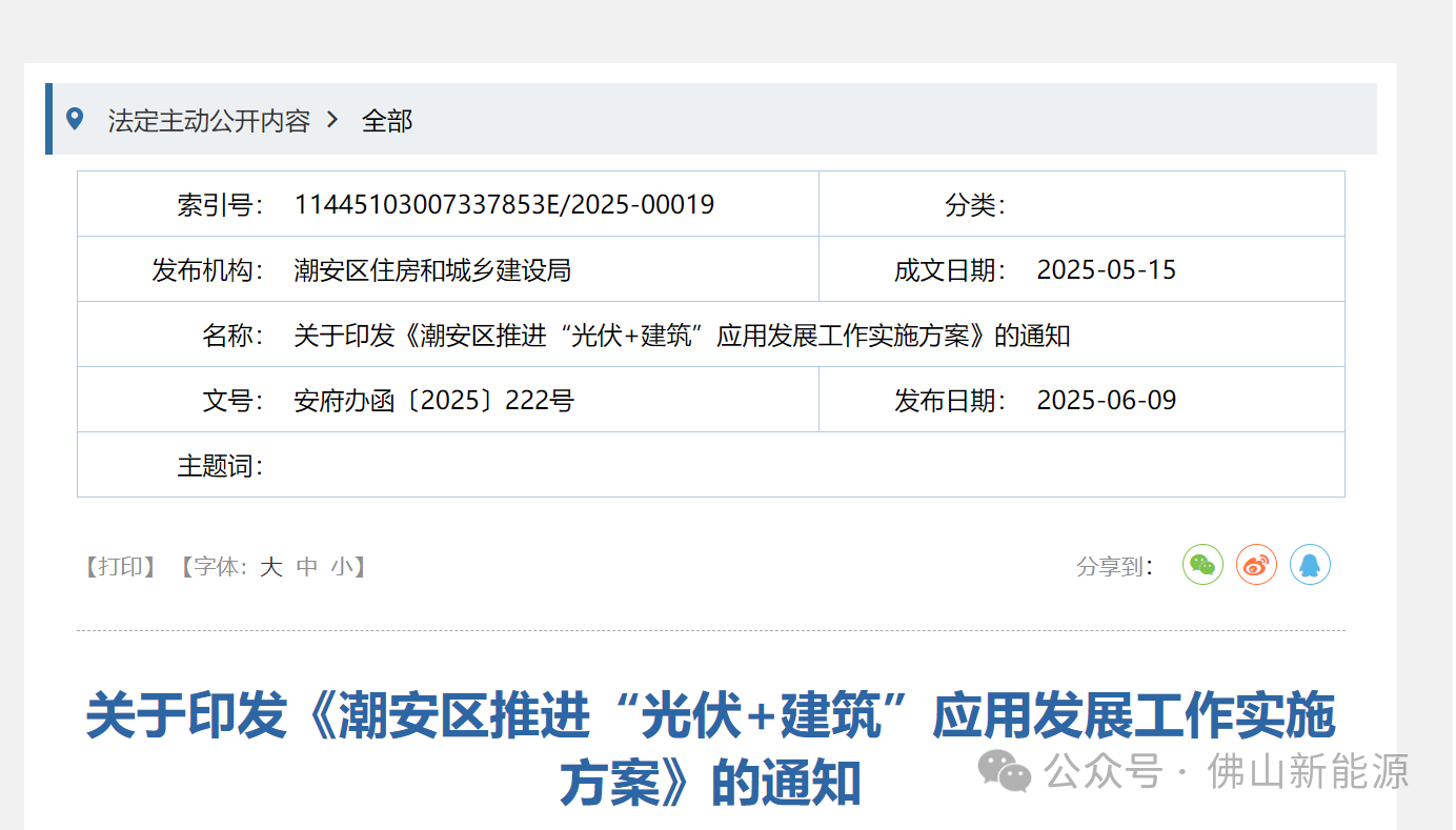 6月9日,潮安区住房和城乡建设局发布关于《潮安区推进“光伏+建筑”应用发展工作实施方案》的通知。