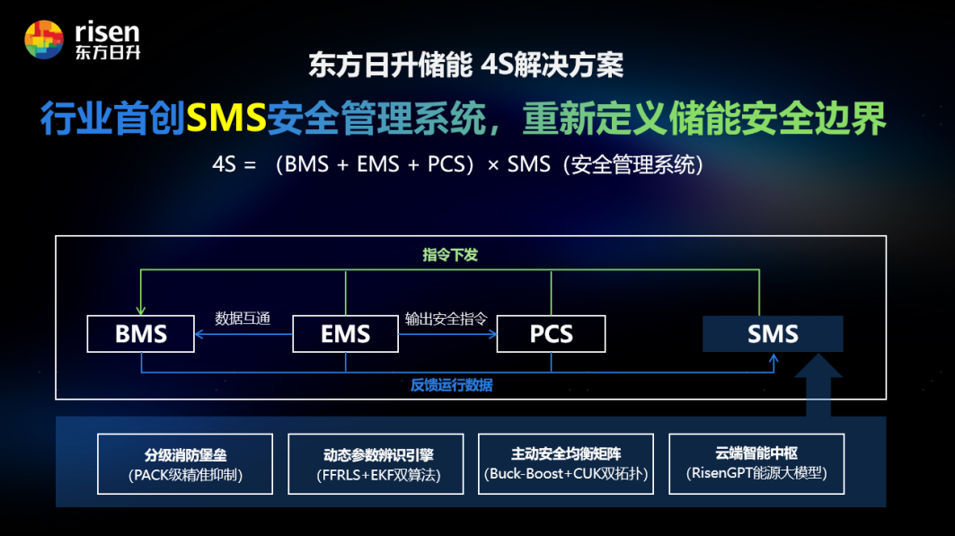 当行业还在以“3S”(BMS+EMS+PCS)构建储能基础框架时,东方日升率先提出了4S解决方案,并实现了全产品应用。该方案通过四维深度协同,构建了(BMS+EMS+PCS)×SMS的安全架构。针对于行业内传统方案的短板,该方案配合东方日升独有的FFRLS+EKF双算法、Buck-Boost+CUK双拓扑策略、“感知-分析-决策-执行”全闭环安全解决方案,不仅能动态追踪电池参数,打造主动安全均衡矩阵,还能通过“事前预防+事中控制+事后兜底”,全方位保障系统安全。