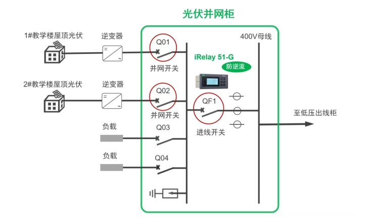 在10kV以下的光伏发电系统中,推荐在光伏并网柜安装iRelay 51-G并投入逆功率保护功能。当并网开关出现逆流,iRelay 51-G监测到逆功率后触发保护动作,选择跳开Q01并网开关,降低发电功率,保证全部发电自发自用;如果iRelay 51-G再次监测到逆功率,便会触发保护动作跳开Q02并网开关,避免发生电网逆流。
