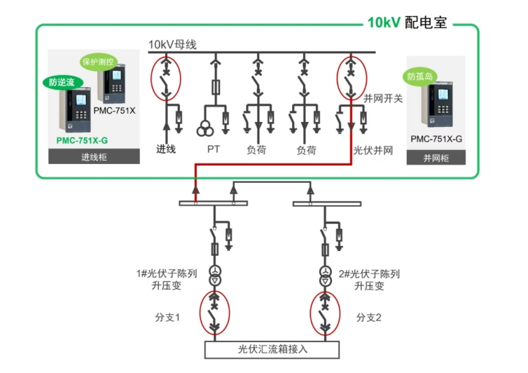 在10kV及以上光伏发电系统中,推荐在进线柜安装PMC-751X-G并投入逆功率保护功能,当进线柜出现逆流,PMC-751X-G监测到逆功率后触发保护动作,跳开分支1或分支2断路器,降低光伏发电功率,保证全部发电自发自用;若PMC-751X-G再次监测到逆功率,便会跳开光伏并网开关,避免发生电网逆流。