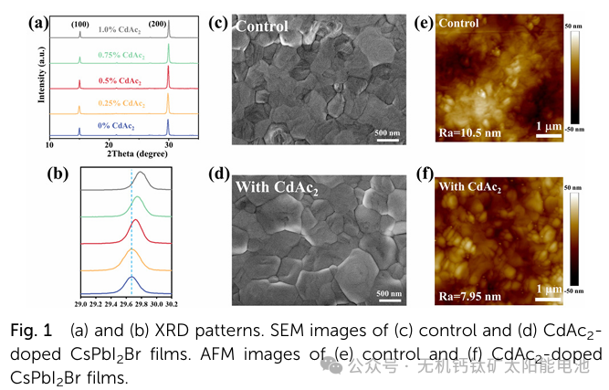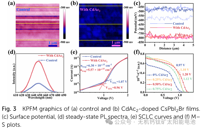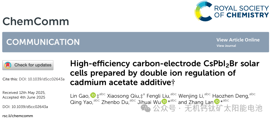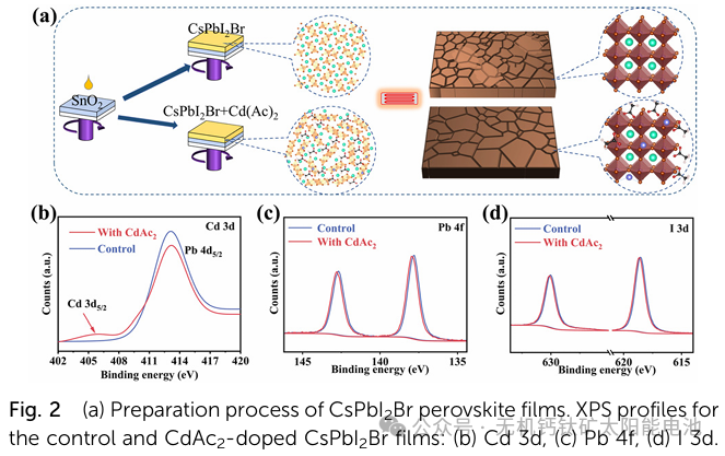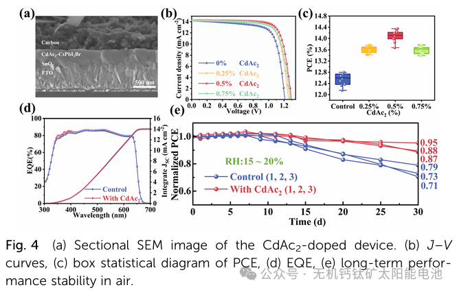 本研究将乙酸镉(CdAc₂)引入 CsPbI₂Br 钙钛矿前驱体混合物中,其中 Cd²⁺和乙酸根离子协同作用,钝化了钙钛矿晶格中 Pb²⁺和卤素离子的空位。经 CdAc₂优化的碳基 CsPbI₂Br 钙钛矿太阳能电池(PSC)展现出了令人瞩目的 14.34%的功率转换效率(PCE)。此外,未封装的器件在环境条件(相对湿度 15 - 20%)下放置 30 天后,仍保持其初始 PCE 的 95%。