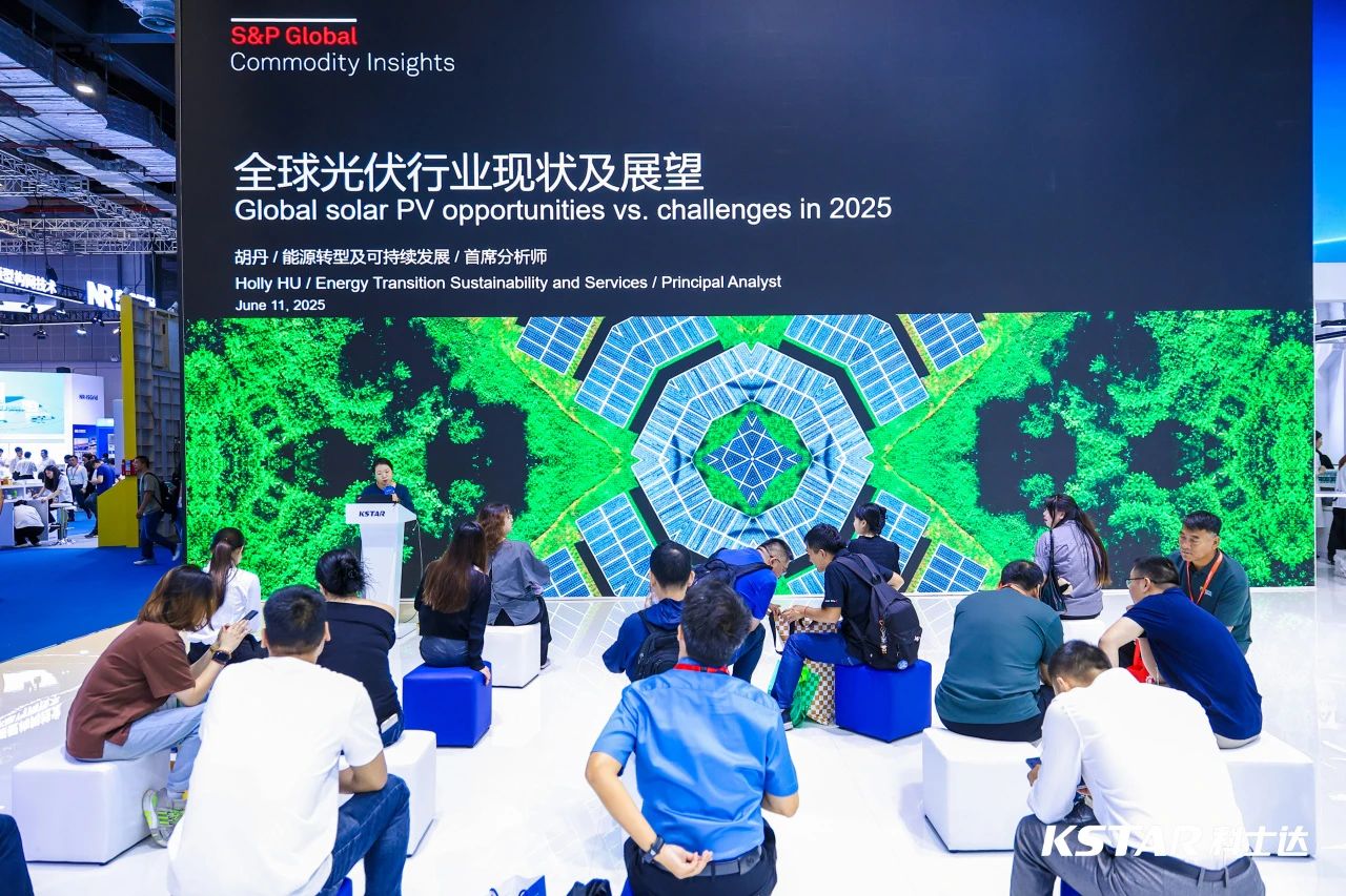 除了亮眼的产品及解决方案外,科士达展台更是大咖云集,精彩纷呈。6月11日的open speech环节,标普全球光伏首席分析师胡丹带来《2025全球光伏市场机遇与挑战》的主题演讲,围绕2025年新能源十大趋势、全球光伏市场需求格局和主要光伏市场趋势等方面进行了全面讲解,为参展者提供了宝贵的市场洞察和行业前瞻。