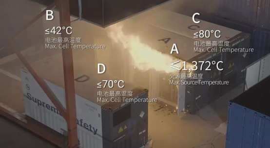 火势峰值阶段:试验第4小时达到最高温度 1372摄氏度,温度监测显示,所有相邻集装箱内的电芯温度均远低于UL9540A电芯层级测试测定设定的电芯热失控触发阈值温度(B箱≤42℃,C箱≤80℃,D箱≤70℃)。