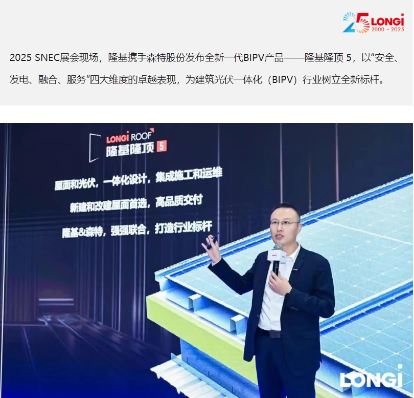 隆基隆顶5的发布,不仅是隆基与森特技术实力的展示,更是对BIPV行业的一次范式变革。正如隆基绿能董事长、总经理钟宝申所说:“BIPV是发展绿色建筑、降低建筑能耗、践行绿色低碳生活的最有效方式之一。中国建筑全过程能耗占全国能源消费总量的45%,碳排放量占全国排放总量的50.6%,BIPV的规模化应用将显著改善这一现状。”