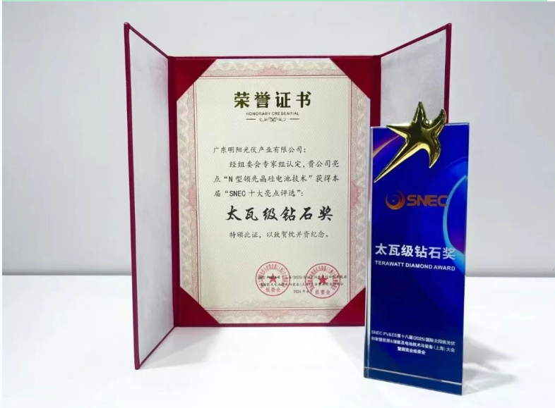此次SNEC盛会上,明阳光伏N型领先电池组件凭借融合0BB技术、负间距设计、高效铜栅以及前瞻性的异质结/钙钛矿叠层技术路线,实现了效率、可靠性与成本效益的全面跃升,成功荣膺“太瓦级钻石奖”!展望未来,明阳光伏将持续深耕核心技术与产品创新,坚定不移地践行绿色低碳发展理念,为全球清洁能源的发展贡献力量。