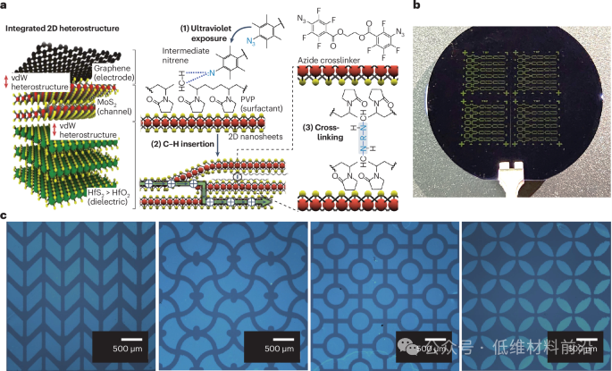 a,二维范德华异质结构的示意图(左),由金属性石墨烯、半导体型MoS₂和绝缘性HfO₂组成;以及相邻二维纳米片之间通过与聚乙烯吡咯烷酮(PVP)表面活性剂发生C–H插入反应实现光交联过程的示意图(右)。