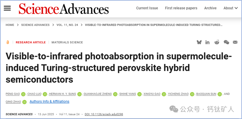 基于此,北京大学赵清教授、苏州大学孙宝全教授、电子科技大学赵怡程教授等人提出了一种新颖的“超分子诱导”策略,创新性地将金属卤化物钙钛矿材料的光吸收(的边界)从本征630 nm显著拓展至2000 nm的红外光区,且具备高吸光度。作者揭示并提出其背后的物理新机制为图灵结构钙钛矿的杂化物质系统内的相间电子跃迁,所制备的光电探测器的性能表现进一步验证和探索了该光吸收拓展的光电应用前景。该成果以“超分子诱导的图灵结构钙钛矿杂化半导体的可见至红外光吸收”(Visible-to-infrared photoabsorption in supermolecule-induced Turing-structured perovskite hybrid semiconductors)为题发表在顶级期刊Science Advances 上。