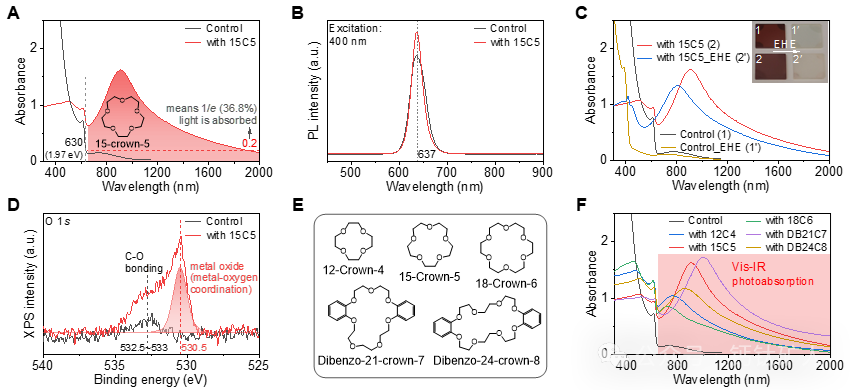 图1. 超分子诱导策略实现钙钛矿的光吸收拓展:显著的可见至红外的光吸收。针对以上科学问题,作者提出一种新颖的超分子冠醚诱导策略,将冠醚分子引入钙钛矿中,将钙钛矿的光吸收从630 nm连续拓展至2000 nm的红外光区:在750-1100 nm、1100-1500 nm、1500-2000 nm范围分别实现了>90%、68.4-90%、36.8-68.4%的光吸收(图1)。作者发现,无论钙钛矿晶体处于高对称的黑相(β相)还是由于环境湿度转变为黄相(δ相),这种特征的显著的光吸收拓展依然保持;并且还系统研究了五种不同的冠醚分子,发现它们在实现光吸收拓展方面具有一致的普适性(图1)。