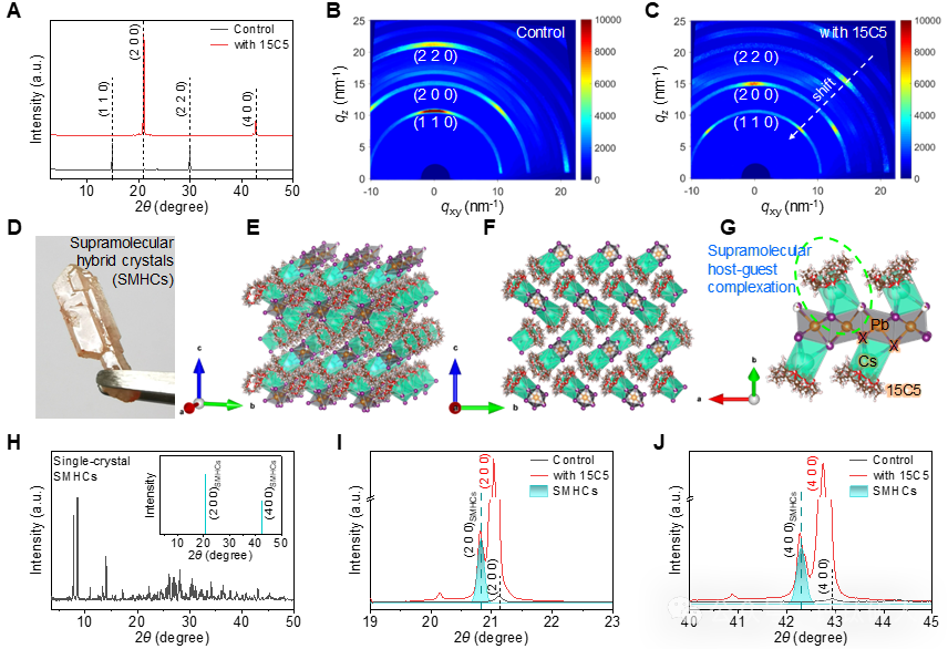 图2. 超分子冠醚诱导的晶格调制和生长超分子杂化晶体。通过XPS、FTIR等发现,这种超分子冠醚可以与钙钛矿组分之间形成强的超分子主客体相互作用。通过XRD、GIWAXS、SCXRD等发现,冠醚分子不仅调制钙钛矿晶格结构,而且诱导生成了一种全新的物质晶体相“超分子杂化晶体”,作者首次合成制备了相应单晶样品、确认了晶体结构并予以命名,获得的剑桥晶体学数据库(CCDC)的编号为2305945(图2)。