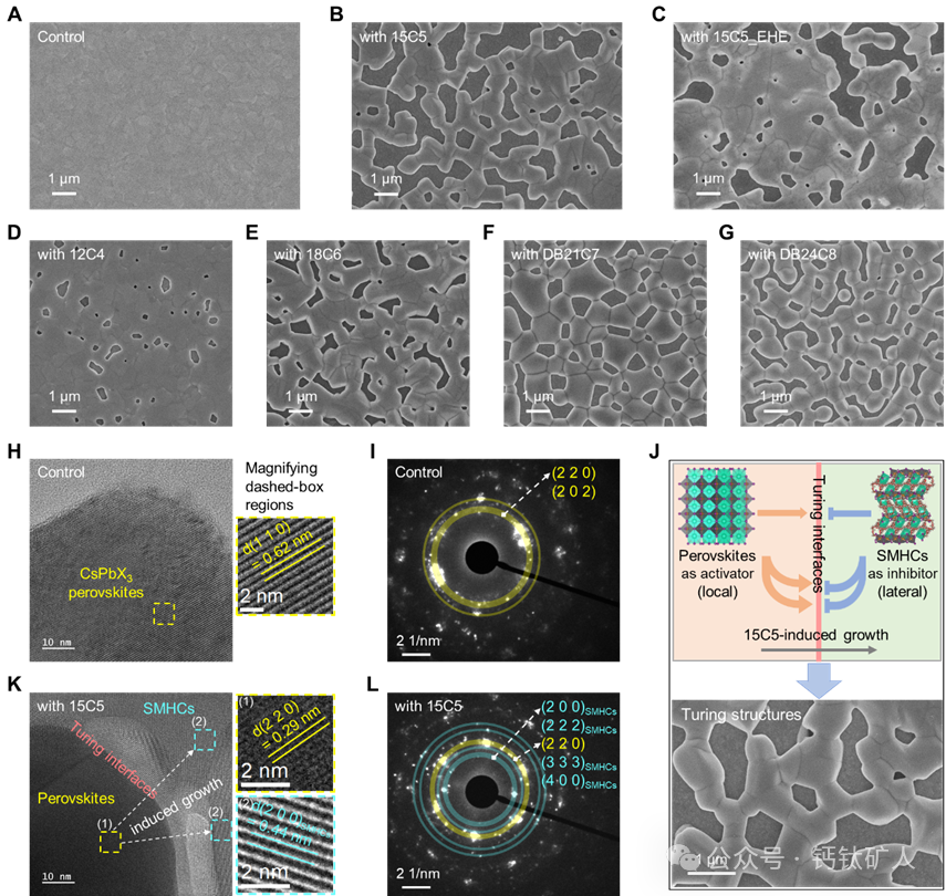 图3. 自组织图灵结构的钙钛矿薄膜。同时,作者通过SEM和HRTEM观察所制备的钙钛矿薄膜发现,原钙钛矿晶体作为激活相,超分子杂化晶体作为抑制相,它们共同构建形成一种独特的具有双相结构的“自组织图灵结构的钙钛矿”薄膜;并且对于五种不同冠醚分子或黄相钙钛矿,这种图灵结构都具有高度普适性(图3)。