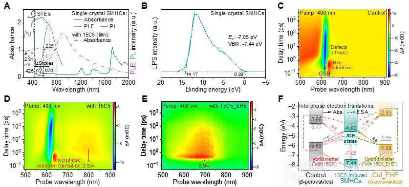 图4. 光电子能谱和飞秒瞬态吸收光谱等揭示光吸收拓展背后的物理新机制:相间电子跃迁。为了揭示光吸收拓展背后的物理机理,作者通过UV-Vis-NIR、PL/PLE、紫外光电子能谱(UPS)和超快飞秒瞬态吸收光谱(fs-TA)等表征开展了深入而系统的研究。最终发现并提出,显著的可见至红外光吸收拓展的物理学新机制为:图灵结构钙钛矿的杂化物质系统内(即钙钛矿晶体与超分子杂化晶体)的相间电子跃迁(图4)。