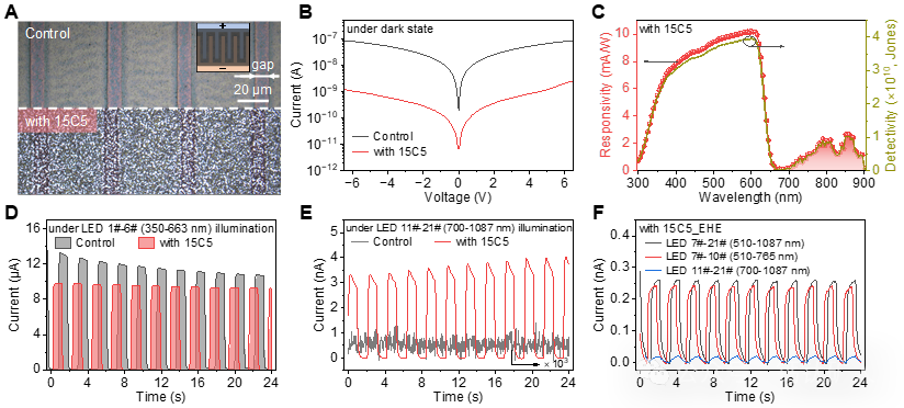 总之,本研究提出一种新颖的“超分子诱导”策略,在金属卤化物钙钛矿中实现了显著的可见至红外的光吸收,光谱拓展至2000 nm。超分子冠醚通过与钙钛矿之间的超分子主客体相互作用,不仅对钙钛矿进行晶格调制,还诱导得到一种全新的超分子杂化晶体。原钙钛矿晶体与超分子杂化晶体共同构建形成一种独特的具有双相结构的“自组织图灵结构的钙钛矿”薄膜。深入而系统的研究揭示出,显著的可见至红外光吸收拓展背后的物理学新机制为图灵结构钙钛矿的杂化物质系统内(即钙钛矿晶体与超分子杂化晶体)的相间电子跃迁。最后,可见至近红外光电探测器的性能表现进一步验证和展示了光吸收拓展的光电应用前景。