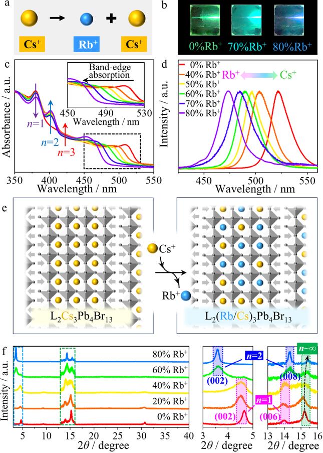 图 1. a, e) 通过部分替换Cs+离子为Rb+离子,实现的Rb-Cs合金化准二维钙钛矿的示意图。b-d) 在400纳米激光激发下的光学图像,Rb-Cs合金化准二维钙钛矿L2(Rb/Cs)3Pb4Br13薄膜的稳态吸收和光致发光(PL)光谱。f) L2(Rb/Cs)3Pb4Br13薄膜的X射线衍射(XRD)图谱。