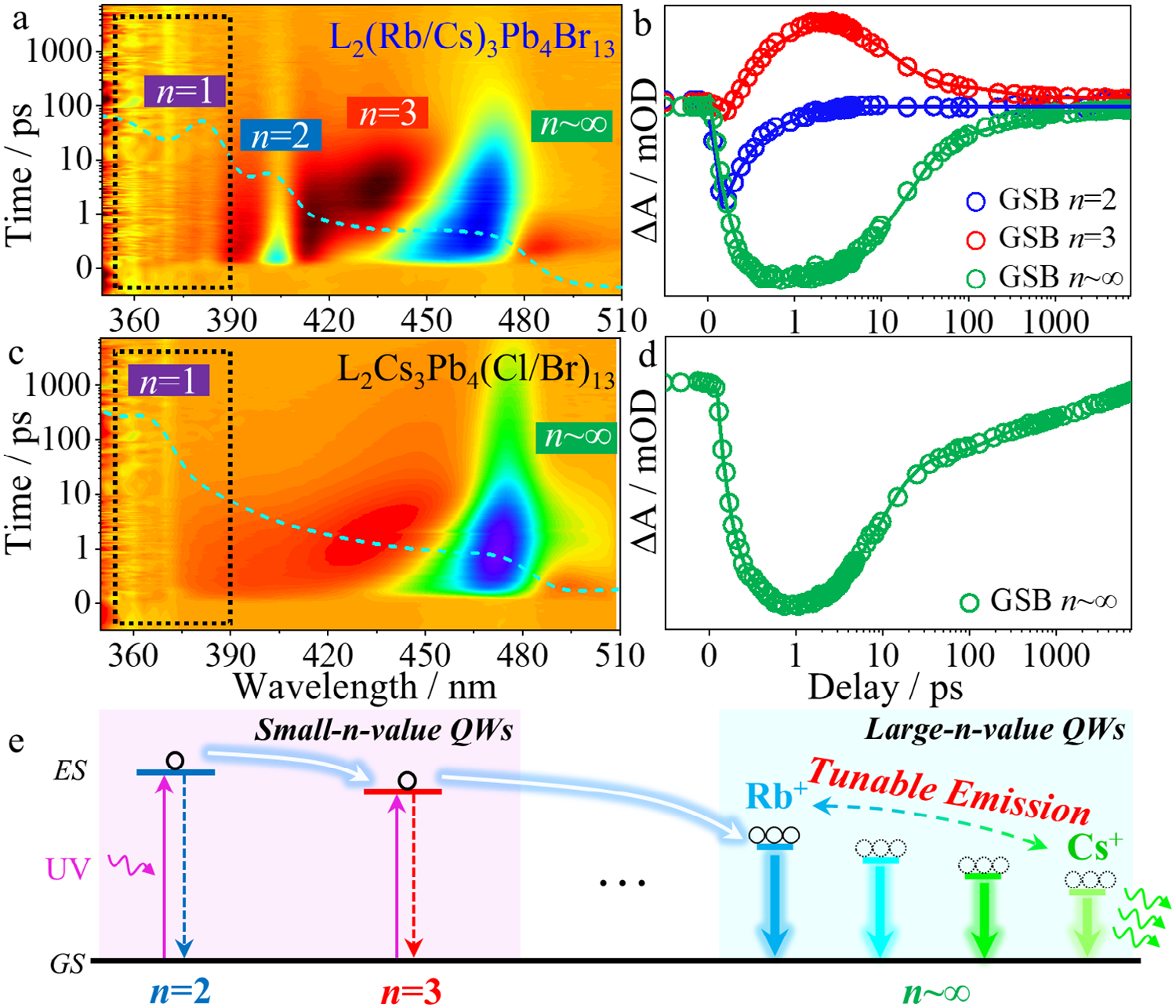 图 2. a, c) 在370纳米飞秒激光脉冲激发下,L2(Rb0.7Cs0.3)3Pb4Br13和L2Cs3Pb4(Cl0.25Br0.75)13薄膜的时间分辨瞬态吸收(TA)光谱。b, d) 在(a, c)中的GSB峰(ground state bleach,基态漂白)处探测的TA动力学。e) L2(Rb/Cs)3Pb4Br13薄膜中能量转移的示意图。