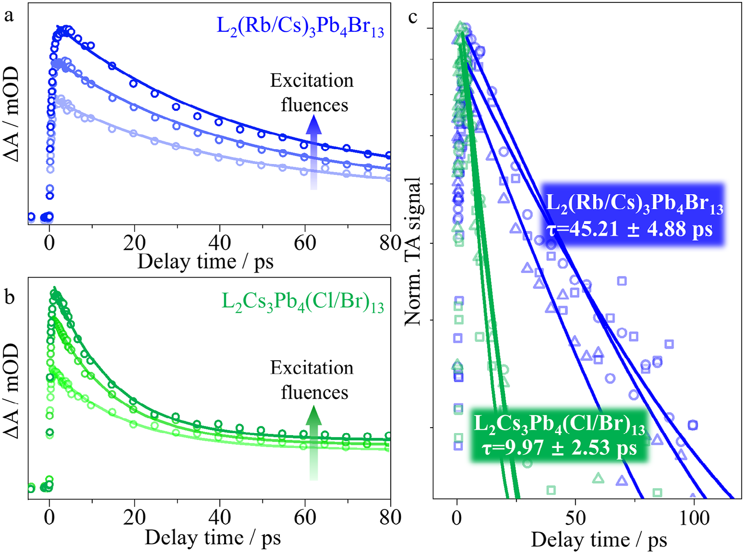 图 3. a, b) 在不同激发通量(1.67、3.33和8.33 nJ·脉冲−1)下,L2(Rb0.7Cs0.3)3Pb4Br13和L2Cs3Pb4(Cl0.25Br0.75)13薄膜的n ≈ ∞ GSB动力学(n ≈ ∞ 基态漂白动力学)。c) Auger复合动力学。每种颜色的正方形、圆形和三角形代表从不同激发通量下的n ≈ ∞ GSB动力学中进行的两两相减。