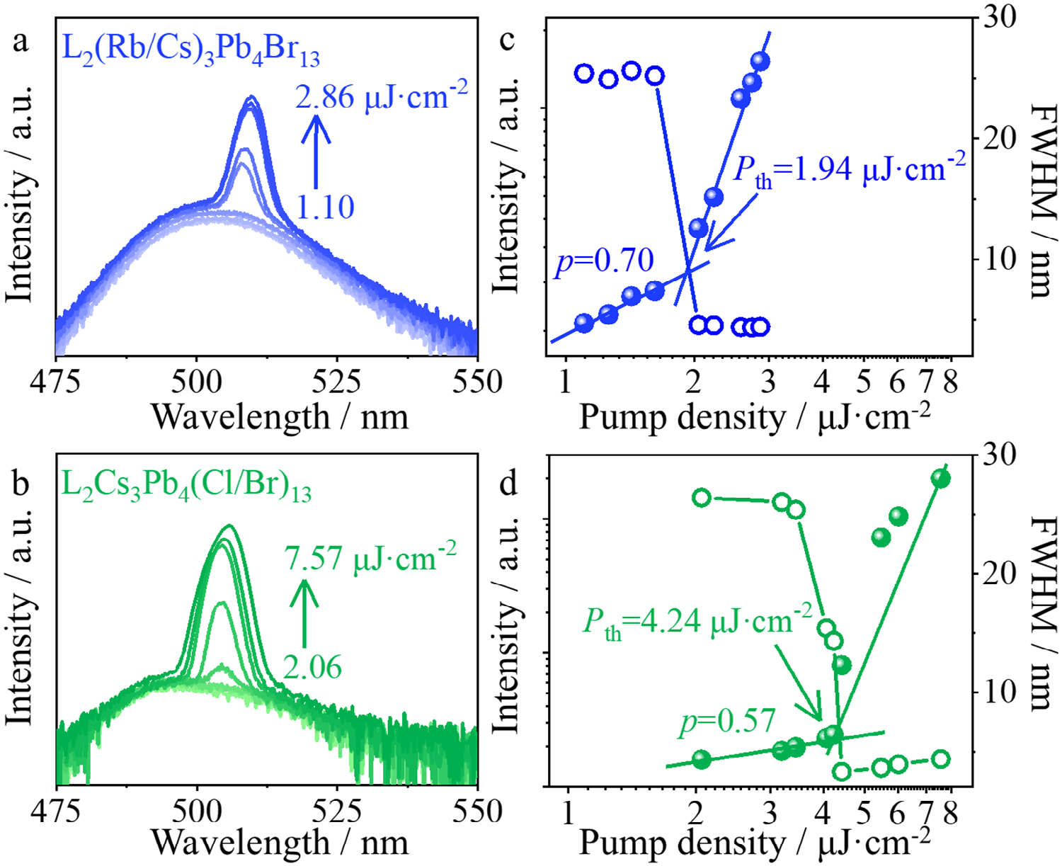 图 4. a, b) L2(Rb0.7Cs0.3)3Pb4Br13和L2Cs3Pb4(Cl0.25Br0.75)13薄膜的泵浦通量依赖性光致发光(PL)光谱。c, d) PL强度和半高宽(FWHM)与泵浦密度的对数-对数图。