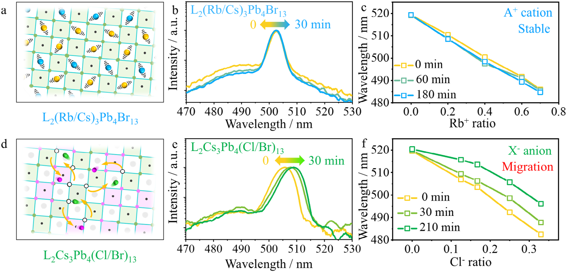 图 5. a, d) Rb-Cs合金化的L2(Rb/Cs)3Pb4Br13薄膜展示了出色的光谱稳定性。b, e) L2(Rb0.7Cs0.3)3Pb4Br13和L2Cs3Pb4(Cl0.25Br0.75)13薄膜在热退火开始后的放大自发发射(ASE)光谱演变。c, f) L2(Rb/Cs)3Pb4Br13和L2Cs3Pb4(Cl/Br)13的自发发射波长随热退火时间的变化。