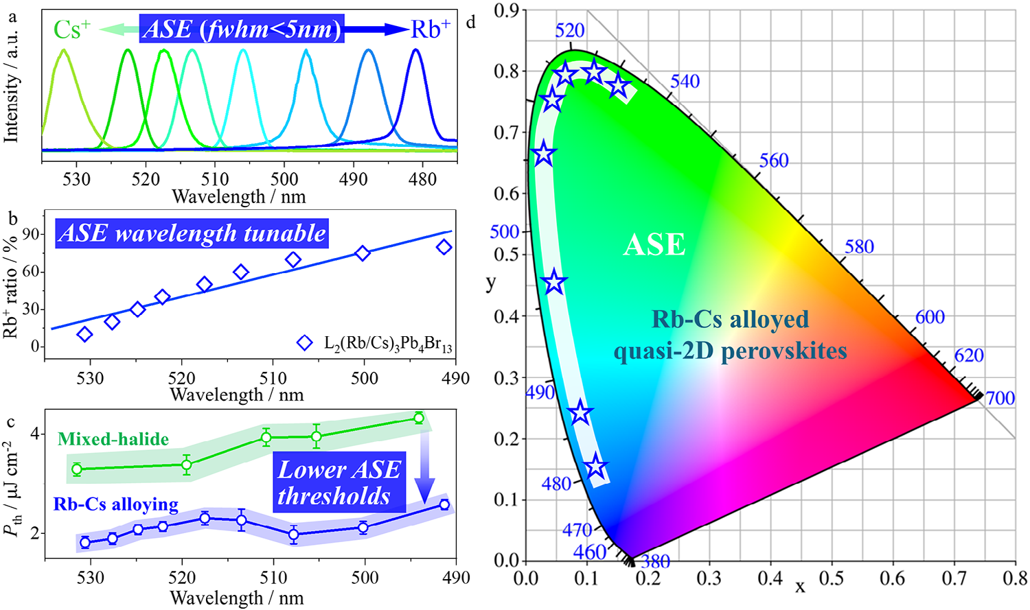 图 6. a, d) 从Rb-Cs合金化的L2(Rb/Cs)3Pb4Br13准二维钙钛矿中可调的低阈值放大自发发射(ASE),覆盖蓝色和绿色光谱区域。b) ASE波长作为Rb+投料比率的函数。c) Rb-Cs合金化的L2(Rb/Cs)3Pb4Br13和混合卤化物L2Cs3Pb4(Cl/Br)13的ASE阈值总结。