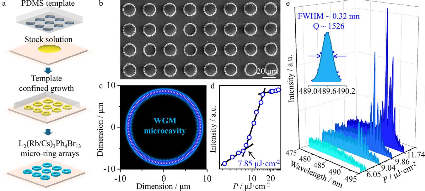 图 7. a) L2(Rb/Cs)3Pb4Br13微环阵列的制备程序示意图。b) L2(Rb/Cs)3Pb4Br13微环阵列的扫描电子显微镜(SEM)图像。c) 微环内的回音壁模式(WGM)光学模式。e) 单个L2(Rb/Cs)3Pb4Br13微环的空间分辨激光光谱。d) PL强度与泵浦密度的对数-对数图。