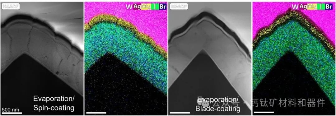 用混合蒸发/旋涂 (l) 和混合蒸发/叶片涂层 (r) 制造的钙钛矿/硅叠层太阳能电池的 STEM 图像 图片来源: Fraunhofer ISE