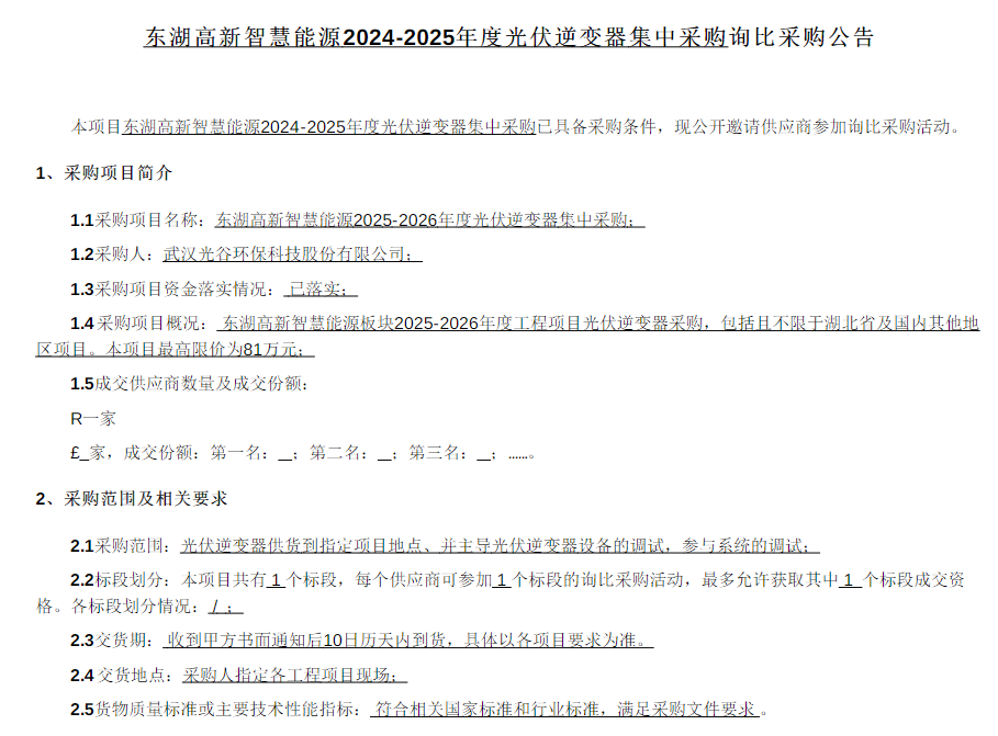 6月15日,东湖高新智慧能源2024-2025年度光伏逆变器集中采购公告发布。采购人武汉光谷环保科技股份有限公司,采购项目为东湖高新智慧能源板块2025-2026年度工程项目光伏逆变器采购,包括目不限于湖北省及国内其他地区项目。本项目最高限价为81万元。