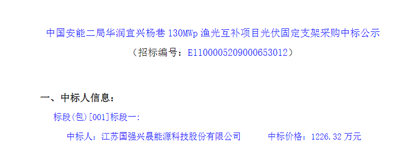 6月17日,中国安能二局华润宜兴杨巷130MWp渔光互补项目光伏固定支架采购中标公示。