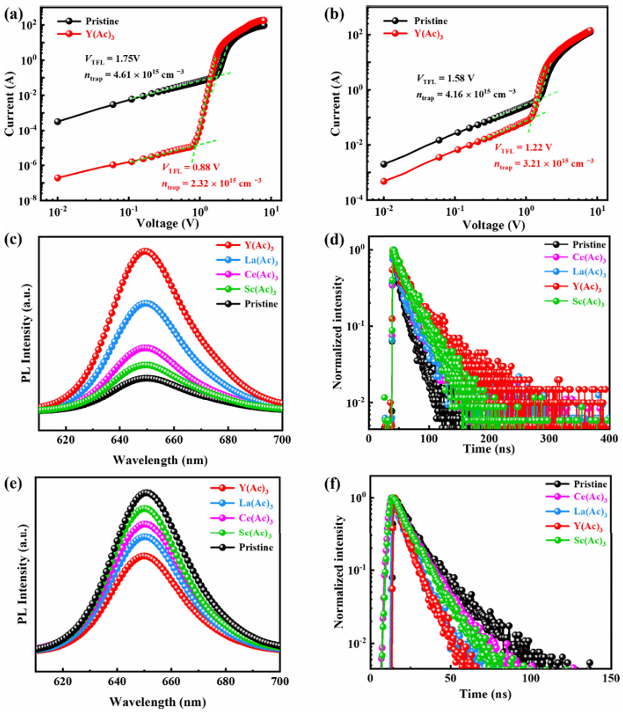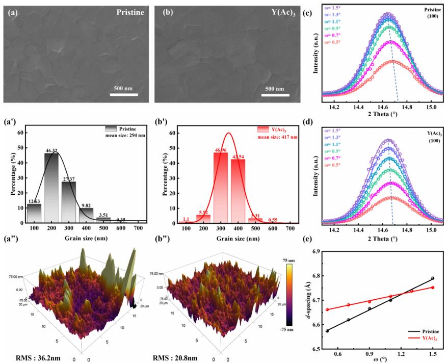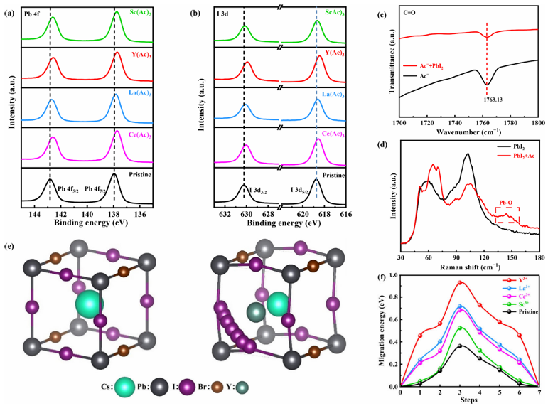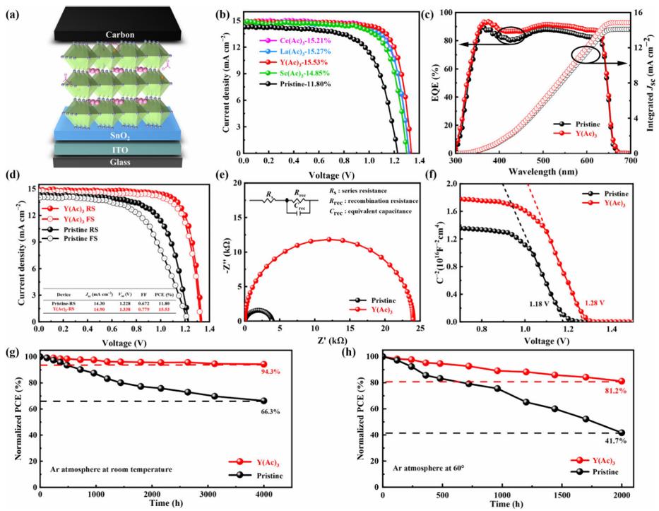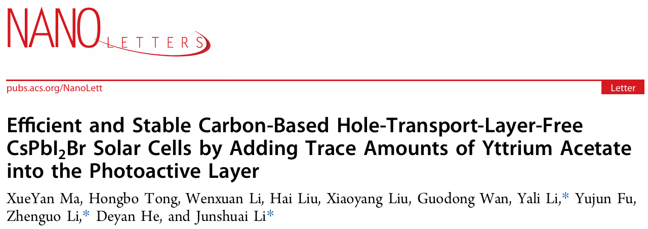 CsPbI2Br太阳能电池是一种重要的无机钙钛矿光伏器件,可用作叠层结构的顶部电池,或用作具有均衡结构稳定性和光吸收的半透明光伏器件。然而,非配位Pb2+和可迁移I-仍然严重阻碍了其能量转换效率(PCE)和长期稳定性问题。鉴于此,2025年5月21日隆基李振国&兰州大学李亚丽&栗军帅于Nano Letters刊发通过在光活性层中添加微量醋酸钇制备高效稳定的无空穴传输层碳基CsPbI2Br太阳能电池的研究成果,为了有效地钝化非配位Pb2+并同时锚定可迁移I-,本文提出了一种简单的策略,即在光活性层中添加醋酸钇(Y(Ac)3)。15.53%的领先效率,加上显著提高的稳定性和降低的电流电压滞后,表明了这种添加策略的有效性,正如碳基无空穴传输层(HTL)CsPbI2Br太阳能电池所证明的那样,它们具有比传统太阳能电池更高的性能成本比,因为它们放弃了使用贵金属电极和昂贵的有机HTL,而这些对光活性层也是有害的。