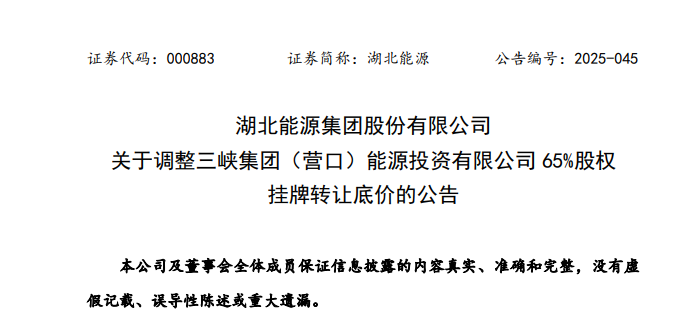 6月20日,湖北能源发布公告称,将营口能投65%股权挂牌转让底价在首轮挂牌价格的基础上降价10%,将挂牌转让底价调整为5,031.792万元。
