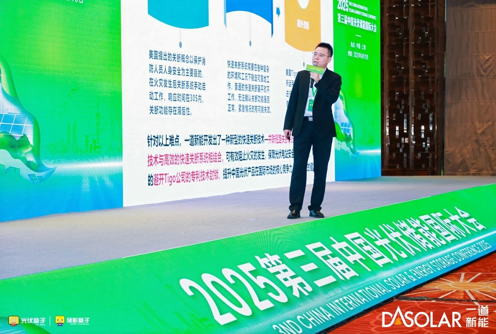 近日,第十八届国际太阳能光伏与智慧能源大会暨展览会(以下简称“SNEC”)在上海圆满落幕。光伏行业历经多年的发展,走进了越来越多人的生活。城市光伏作为多场景应用之一也迎来了快速发展浪潮,一道新能以技术创新为核心,全新推出了快速关断智能系统与轻质光伏系列产品,系统性解决了城市场景下电站安全与安装难题,为“光伏+”领域的规模化应用提供全场景解决方案。SNEC展会期间,一道电气总经理印玉根先生受邀参加2025第三届中国光伏储能国际大会并发表《一秒关断并联短路新技术,保障光伏电站安全发电》主题报告,同期在第二届光电建筑防火安全研讨会受邀作《一道智能关断系统产品系列介绍》主题演讲;一道新能组件研究中心总监介雷先生在展台活动中作《轻量组件技术和多场景应用解决方案》主旨演讲。