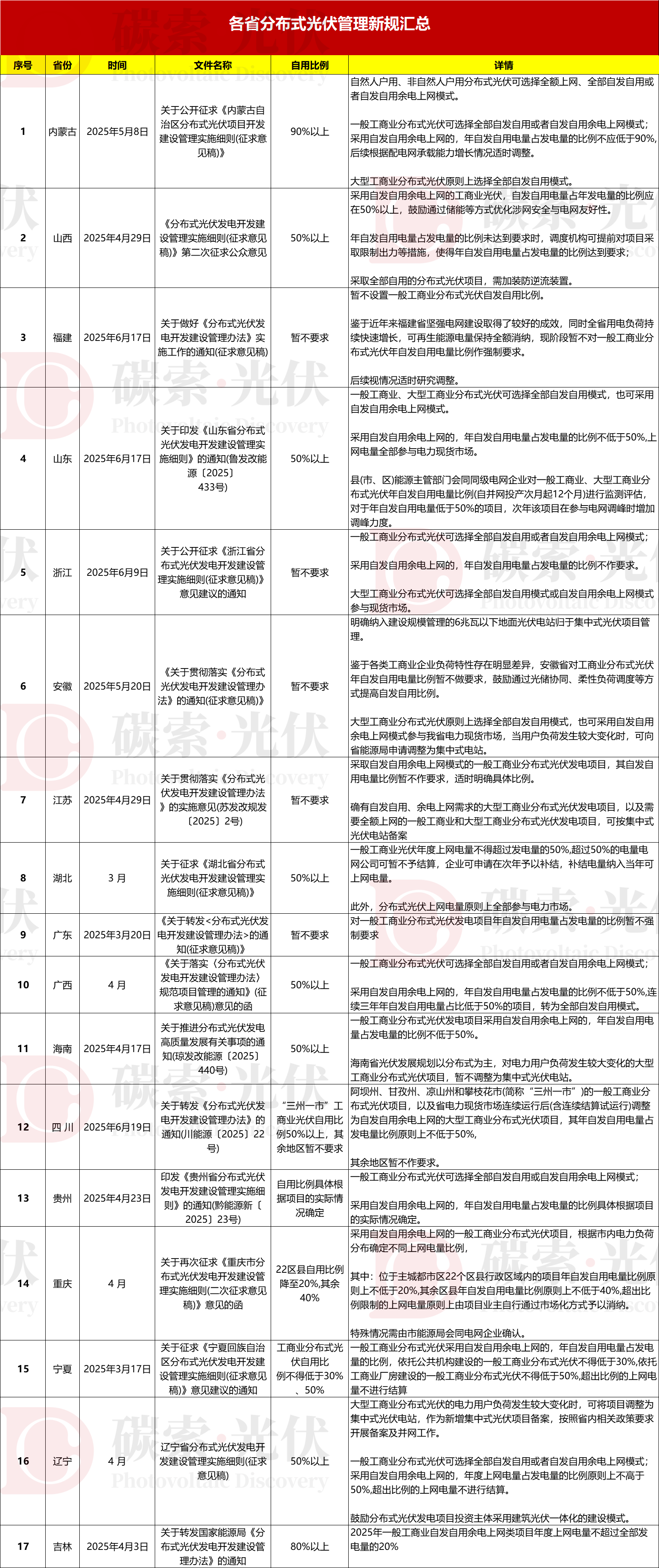 据统计,截至6月22日,全国已有17个省份发布分布式光伏新政相关文件,政策核心围绕自发自用比例要求及超额上网处置措施展开。
