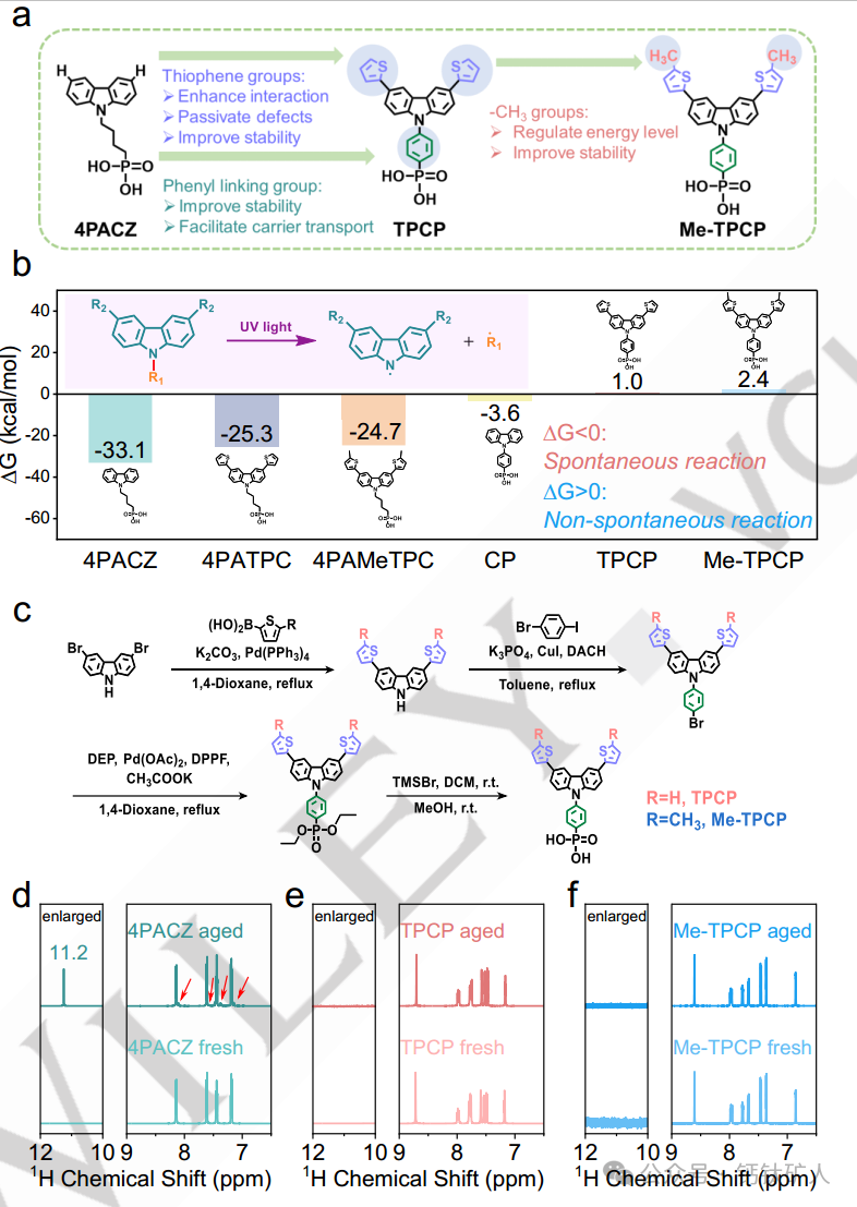 图1. (a) Me-TPCP和TPCP的分子设计和结构功能关系分析。(b)反应中吉布斯自由能变化的统计分析。(c)TPCP和Me-TCP的合成路线。UV老化前后(d)4PACZ、(e)TPCP和(f)Me-TPCP的1H NMR光谱的变化(左侧图片是12-10ppm之间的光谱放大图)。