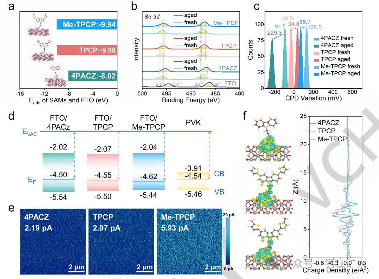 3d的X射线光电子能谱(XPS),TPCP/FTO和Me-TPCP/FTO在UV老化前后的表面电位分布。(c)沉积在FTO上的新鲜自组装膜和365 nm UV老化后的表面电位分布。(d)能级排列图。(e)导电原子力显微镜(c-AFM)(f)具有不同电荷密度的FTO表面上的4PACZ(顶部)、TPCP(中间)和Me-TPCP(底部)的优化构型。