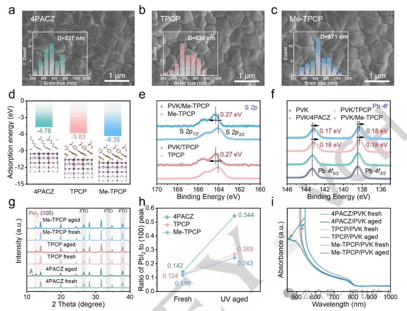 图3. 沉积在(a)4PACZ/FTO、(B)TPCP/FTO和(c)Me-TPCP/FTO衬底上的钙钛矿的顶视图SEM图像和相应的晶粒尺寸分布直方图。(d)钙钛矿的(100)晶面与SAM之间的相互作用的示意图,以及相应的埃兹值。(e)来自自组装膜和具有自组装膜的钙钛矿的S 2 p信号的XPS光谱。(f)(g)不同自组装膜的钙钛矿在空气中以108 mW·cm-2的总剂量在365 nm紫外光下老化72小时前后的XRD图谱。h)新鲜样品和紫外光老化样品XRD中PbI_2峰和钙钛矿(100)峰强度比的变化。(i)新鲜样品和紫外光老化样品的紫外-可见光谱。
