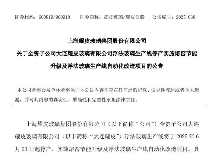 6月21日,耀皮玻璃公告称,全资子公司大连耀皮玻璃有限公司(以下简称“大连耀皮”)浮法玻璃生产线将于 2025 年 6月 23 日起停产,实施熔窑节能升级及浮法玻璃生产线自动化改造项目。