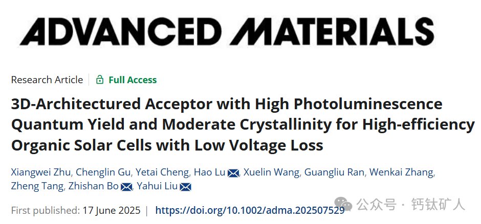 X. Zhu, C. Gu, Y. Cheng, H. Lu, X. Wang, G. Ran, W. Zhang, Z. Tang, Z. Bo, Y. Liu, 3D‐Architectured Acceptor with High Photoluminescence Quantum Yield and Moderate Crystallinity for High‐efficiency Organic Solar Cells with Low Voltage Loss. Advanced Materials, (2025).