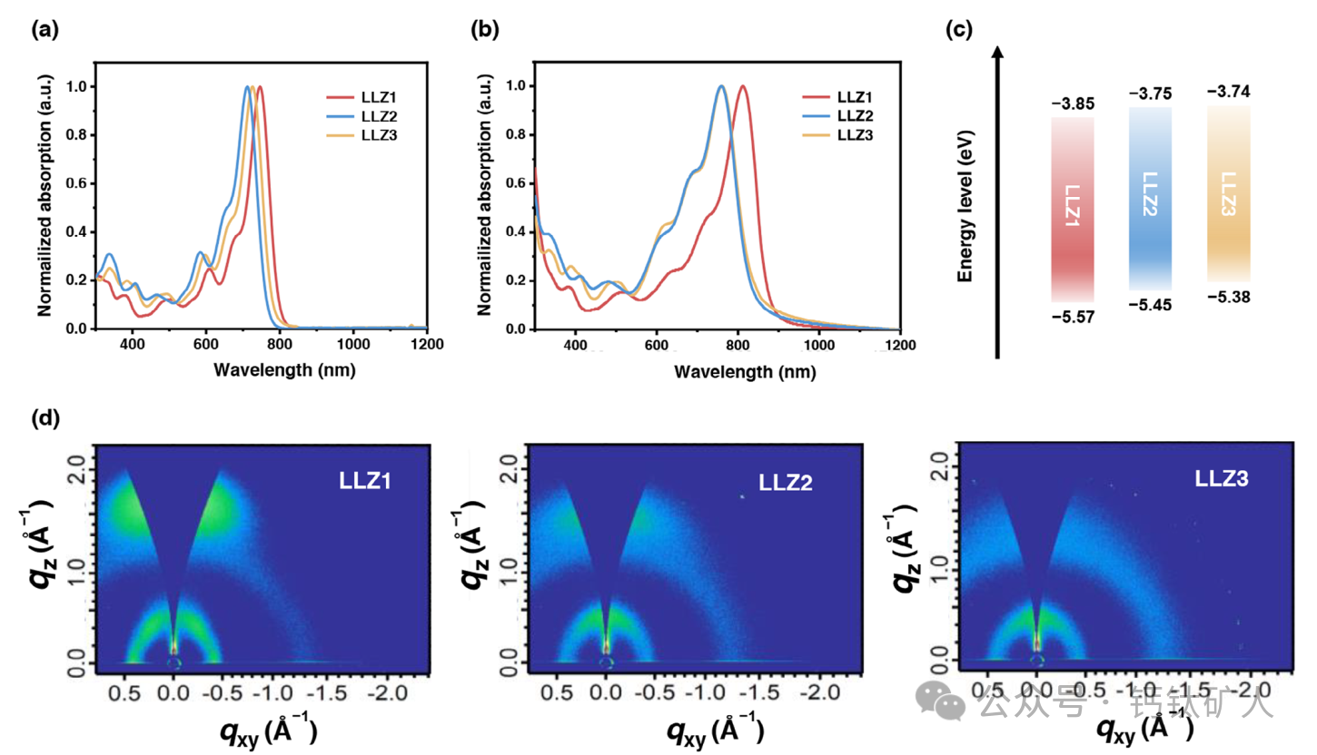 图1. a)LLZ 1、LLZ 2和LLZ 3在氯仿溶液中的UV-Vis吸收光谱; B)LLZ 1、LLZ 2和LLZ 3薄膜的UV-Vis吸收光谱; c)LLZ 1、LLZ 2和LLZ 3的能级分布图; d)LLZ 1、LLZ 2和LLZ 3的2D GIWAXS图案。
