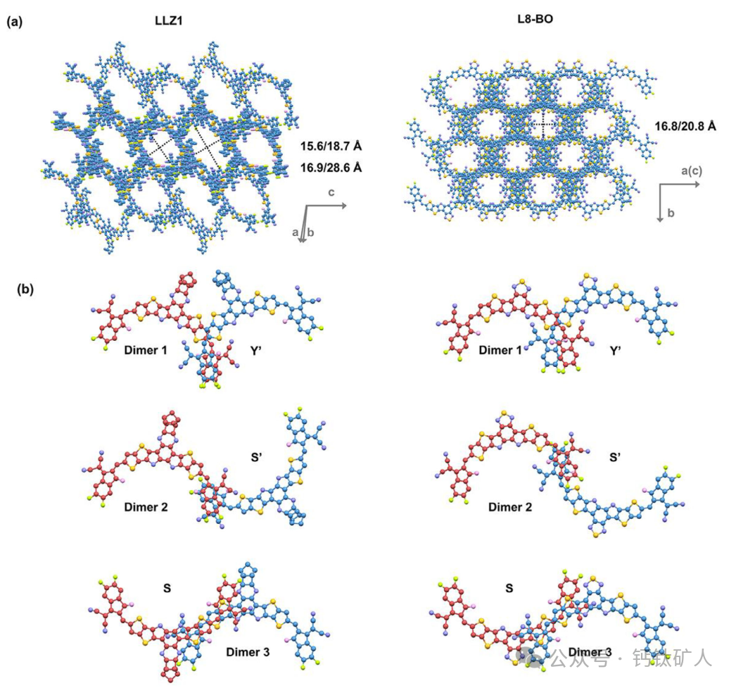 图2. a)LLZ 1和L 8-BO单晶中的分子堆积(省略侧链); B)LLZ 1和L 8-BO单晶结构中的三种分子间二聚体构型(垂直于β-平面观察)。