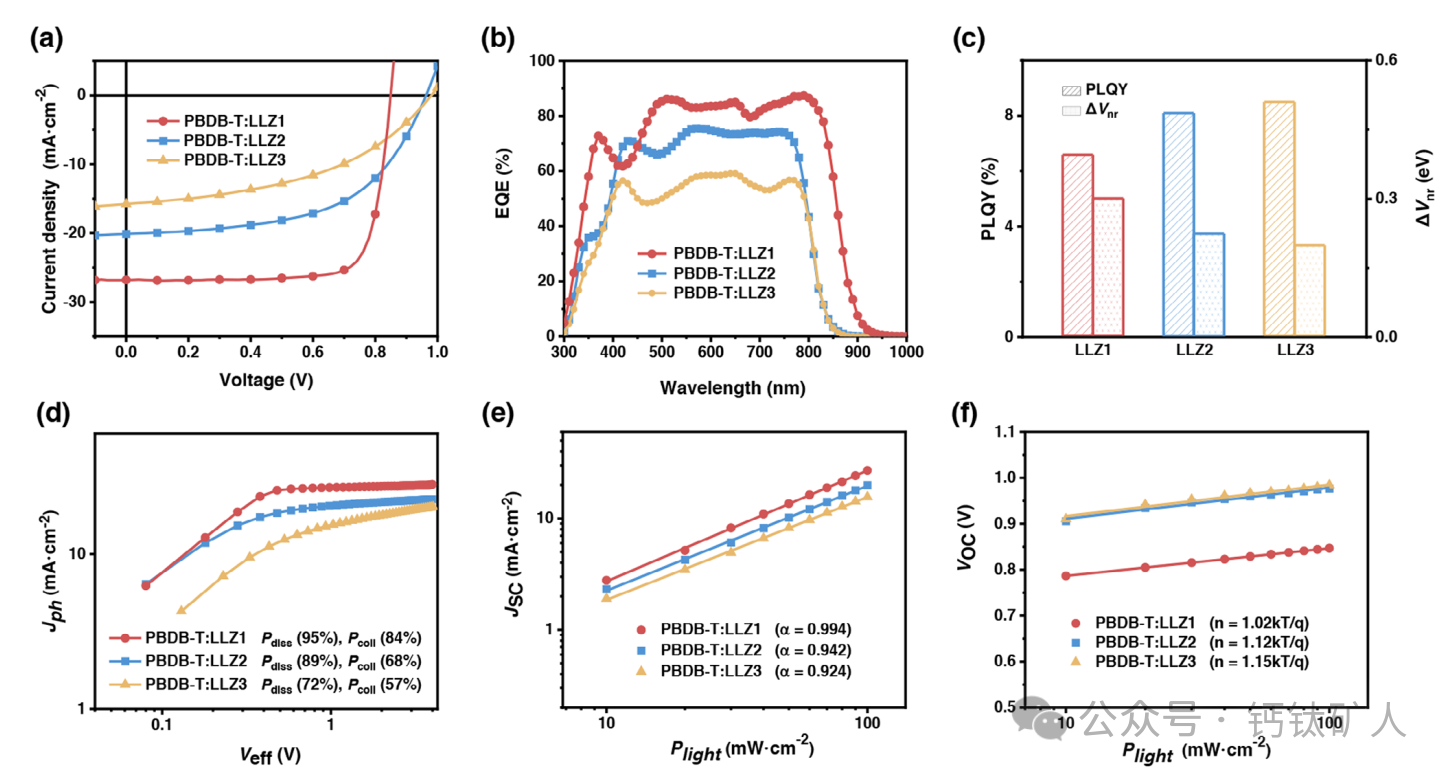 图3. a)J-V曲线; B)EQE曲线; c)受体的PLQY沿着器件的相应ΔEnr; d)Jph对Veff曲线; e)JSC随光强度变化的曲线; f)VOC随光强度变化的曲线。