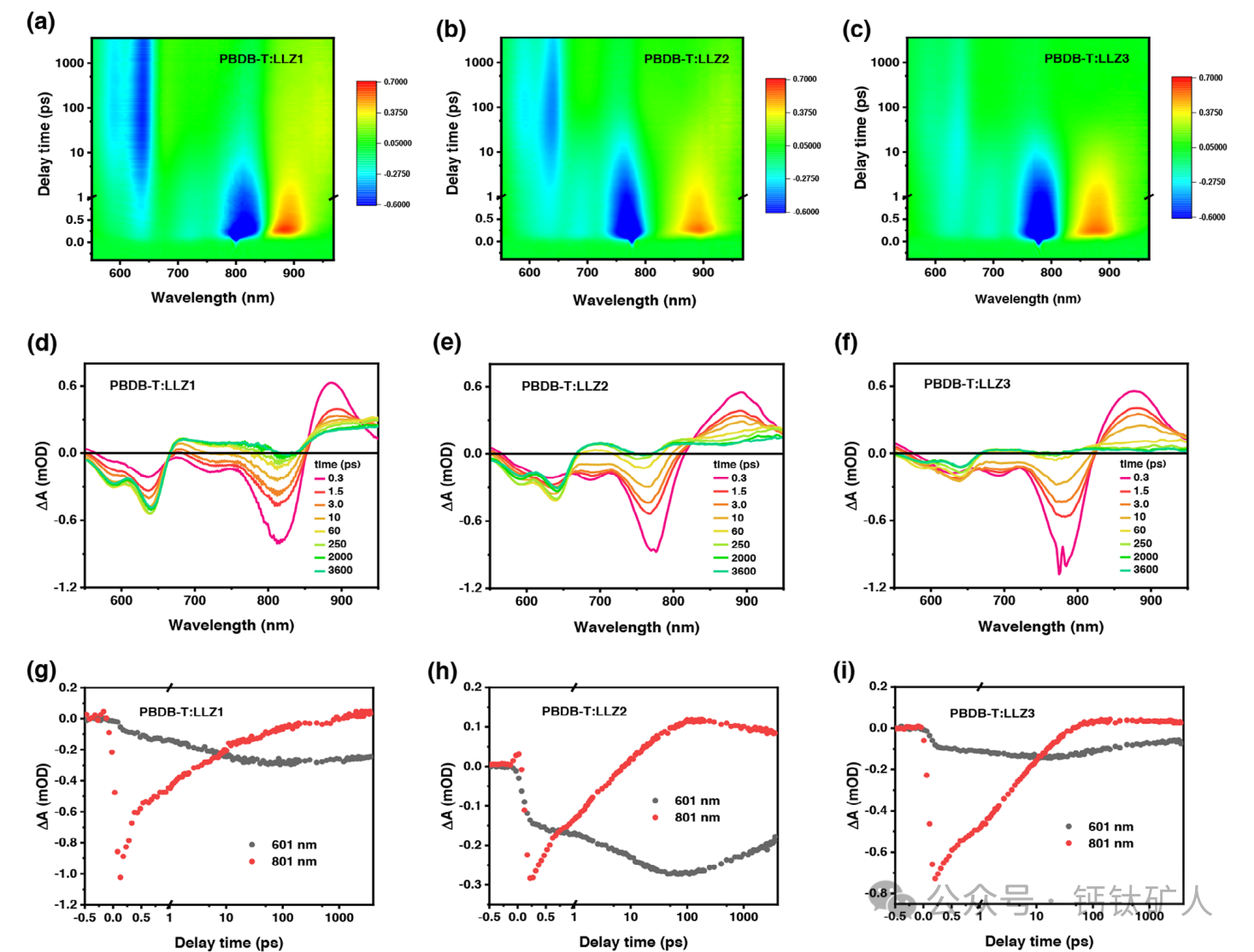 图4. a-c)三种共混物膜的时间分辨吸收差光谱的等高线图。d-f)三种共混物膜在不同延迟时间的TA光谱。g-i)三种共混物膜在选定波长的动力学迹线。