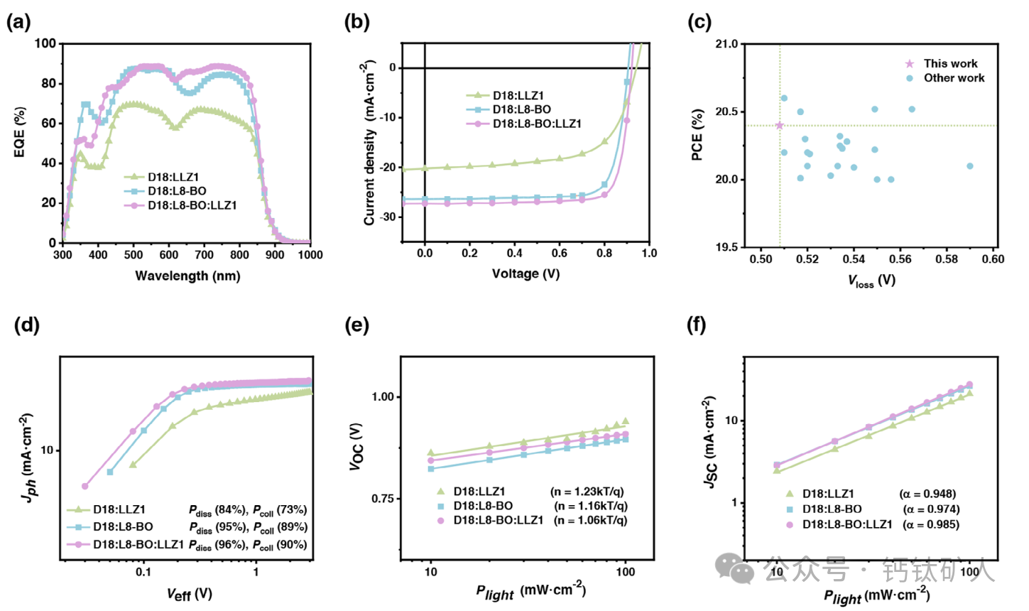 图5. a)J-V曲线; B)EQE曲线; c)PCE和Vloss(对于目前效率超过20%的OSC); d)Jph-Veff曲线; e)JSC随光强度变化的曲线; f)基于D18:LLZ 1、D18:L 8-BO和D18:L 8-BO:LLZ 1的OSCS的VOC随光强度变化的曲线。