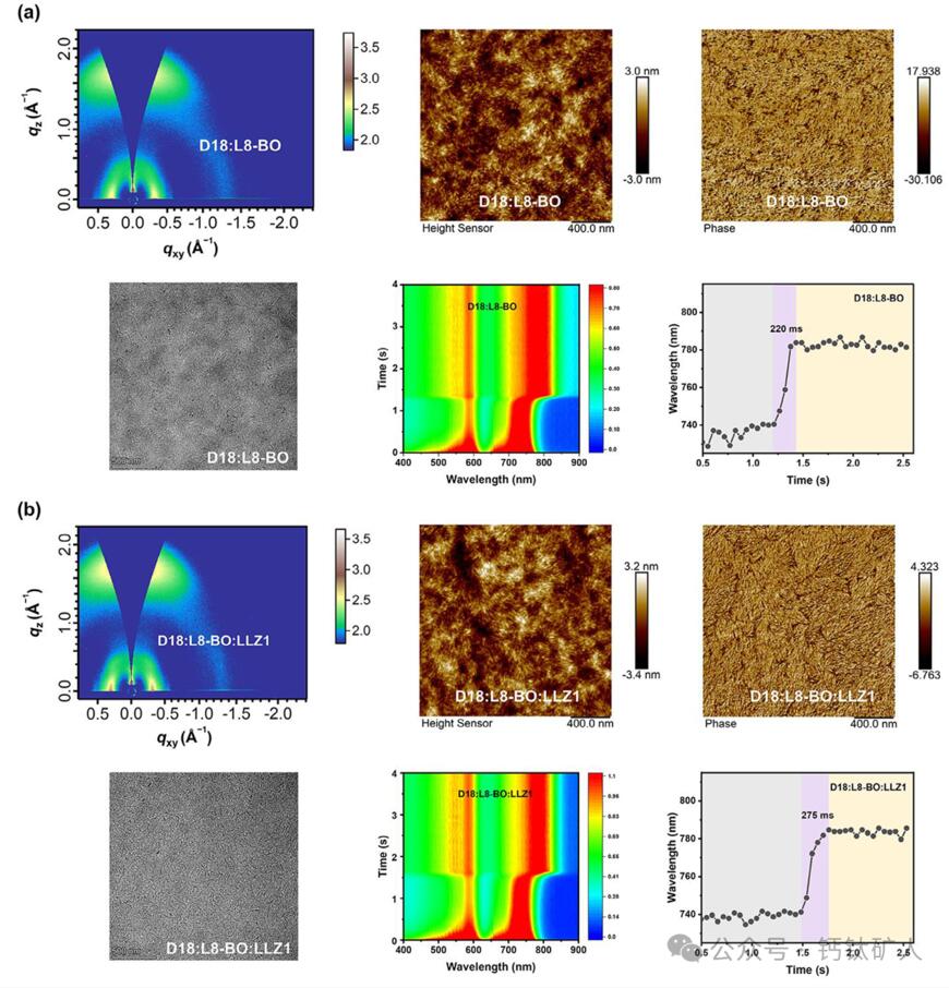 图6. D18:L8-BO(a)和D18:L8-BO:LLZ 1(B)共混物膜的2D GIWAXS图案、AFM高度图像、AFM相位图像、TEM图像和原位UV-Vis吸收光谱。
