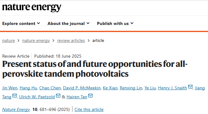 原文:Wen, J., Hu, H., Chen, C. et al. Present status of and future opportunities for all-perovskite tandem photovoltaics. Nat Energy 10, 681–696 (2025). https://doi.org/10.1038/s41560-025-01782-0