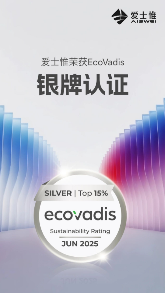 2025年6月,爱士惟在EcoVadis企业社会责任评估中,位列全球参评企业前10%,荣获集团级银牌认证(全球前5%至15%)。这一荣誉是对公司ESG实践与绿色发展理念的肯定,意味着爱士惟在可持续发展、社会责任及企业治理领域的综合表现,超越了全球90%的参评企业。